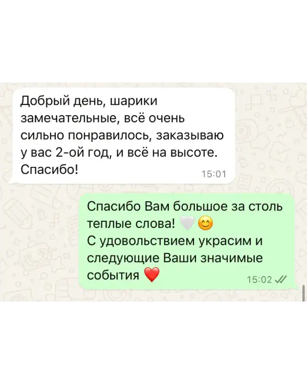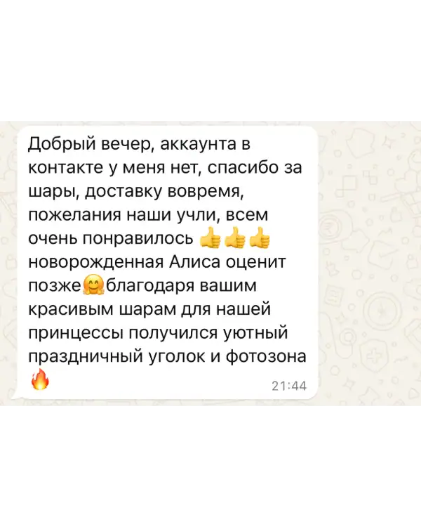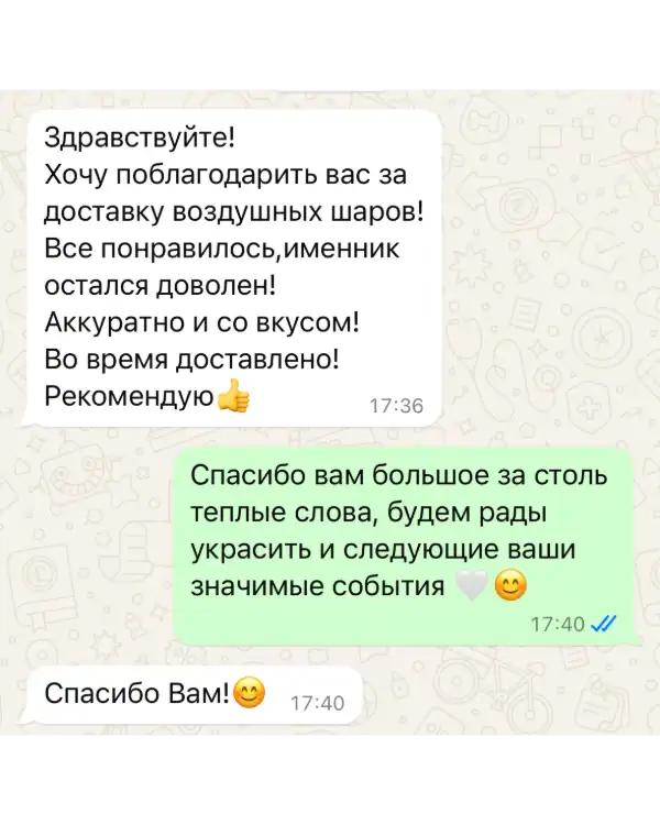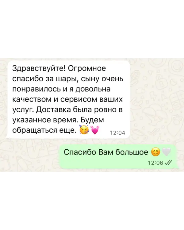 Для нас нет ничего более важного, чем удовлетворение наших клиентов, и мы готовы сделать все возможное, чтобы сделать ваши мероприятия более запоминающимися и яркими. Наша команда профессионалов всегда готова к действию и гарантирует своевременное и качественное выполнение всех заказов, включая доставку воздушных шариков в любое время суток.