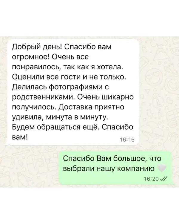 Каждое торжество — это уникальное событие, и мы понимаем, что клиенты иногда сталкиваются с неожиданностями и срочными задачами. Поэтому, мы всегда стараемся быть на связи с нашими клиентами круглосуточно, чтобы оказать им всю необходимую поддержку и помощь. Наша команда профессионалов готова выехать на место проведения мероприятия в любое время и предоставить бесплатную консультацию по оформлению и декорированию.